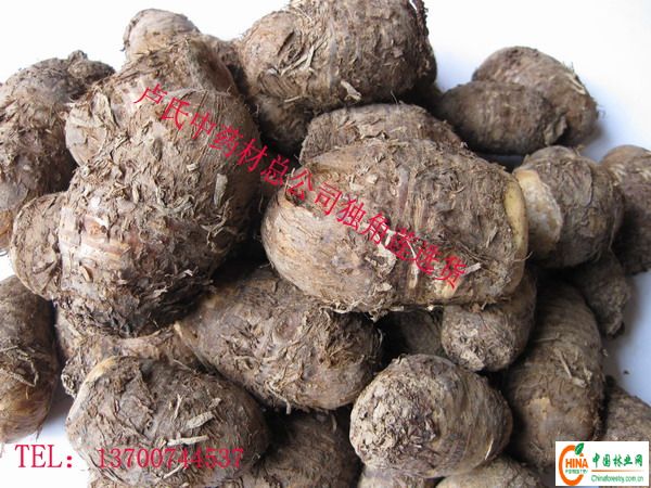 独角莲,药性辛.温.有毒,燥湿利水.排毒之功效。 生长习性:喜温和湿润气侯,能耐寒、耐阴蔽.耐干旱,可与林果庄稼作物间作,沙质土均可种植。栽培技术:选地整地.深翻.耙细,每亩施杂肥2000公斤,并加入复合肥15—20公斤,撒于地面,耕耙整平。 繁殖方法:块茎繁殖,在平整好的土地上按行距35公分,株距25公分,将直径3厘米左右的小块茎放入5厘米的沟内盖平即可,适合全国各地发展种植。当年种植,当年即可收获。 效益分析:亩产鲜品1200公斤,干品300——500公斤,现市场价18——20元,每亩产值6500。 采收加工:可在当年10月间采挖收取块茎3厘米以上,做为商品除去外皮,清水冲洗后,装筐架起距地面20公分,用塑料布包严后用硫黄点燃熏60分钟取出放于席上或水泥地平上晒干,并及时翻动,3厘米以下块茎用沙土混拌贮藏,做为来年种植使用。