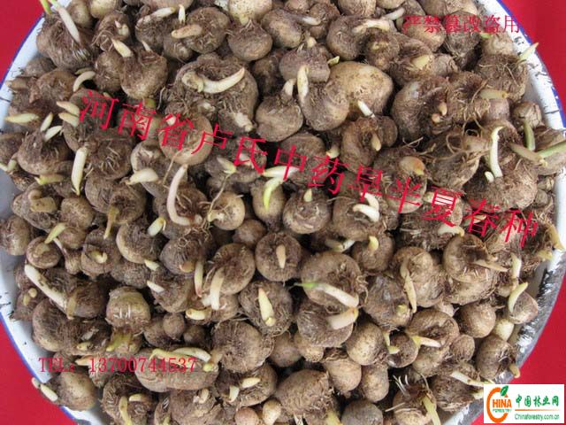 (三)、播种方法:通常采用块茎繁殖,成功率100%,周期短,见效快。利用半夏休眠规律可多次种,多次收获,即4月种7月收,7月种10月收,10月种次年4月收,最好一年种一次。亩用种多少根据种块大小和是否间作决定下种量,一般30-150公斤。种之前,把种块用5%草木灰水浸2小时,或2%硝酸钾浸24小时,或5%多菌灵1000倍液浸。捞出阴干再种。如,与玉米间作,二旁各种玉米3行,成品字形,中间种5行半夏,行距18厘米开沟(每沟对脸种二行),株距7厘米,播种后覆土压实,如迂干旱天气,应及时浇水。