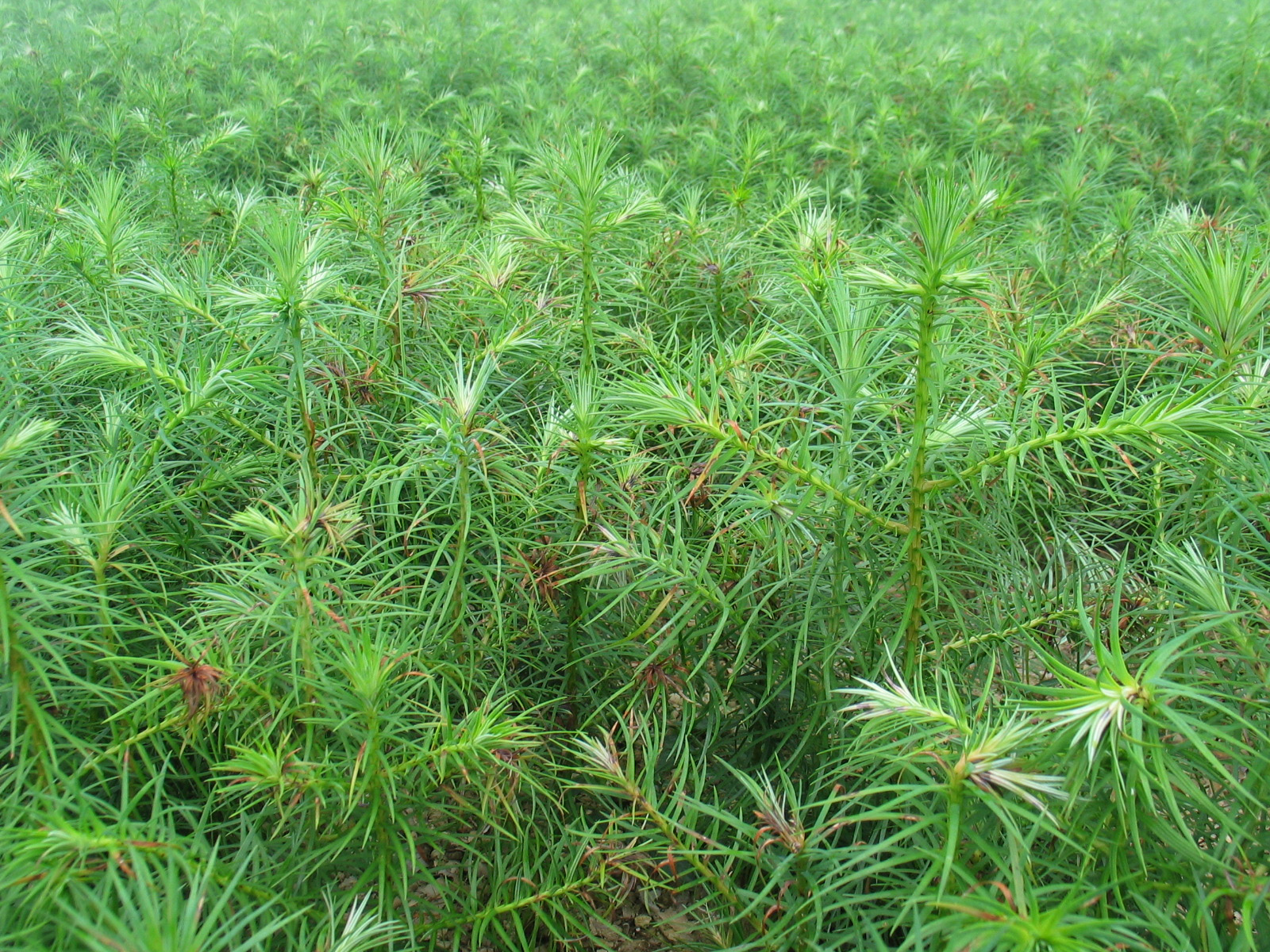 杉木尖枯 受害苗木先是顶部嫩叶上出现黄色斑点,逐渐变红褐色,以后扩展到全叶,使嫩梢赤枯,病斑上散生黑色稍有突起的小点,即病菌的分生孢子盘,潮湿时分生孢子盘吸湿长出褐色或黑褐色的丝状或卷发状的分生孢子角。严重的病苗整株变枯褐色而死亡,轻病苗仅顶梢枯死,常能再发2-3个不定芽,使杉苗成多头状。