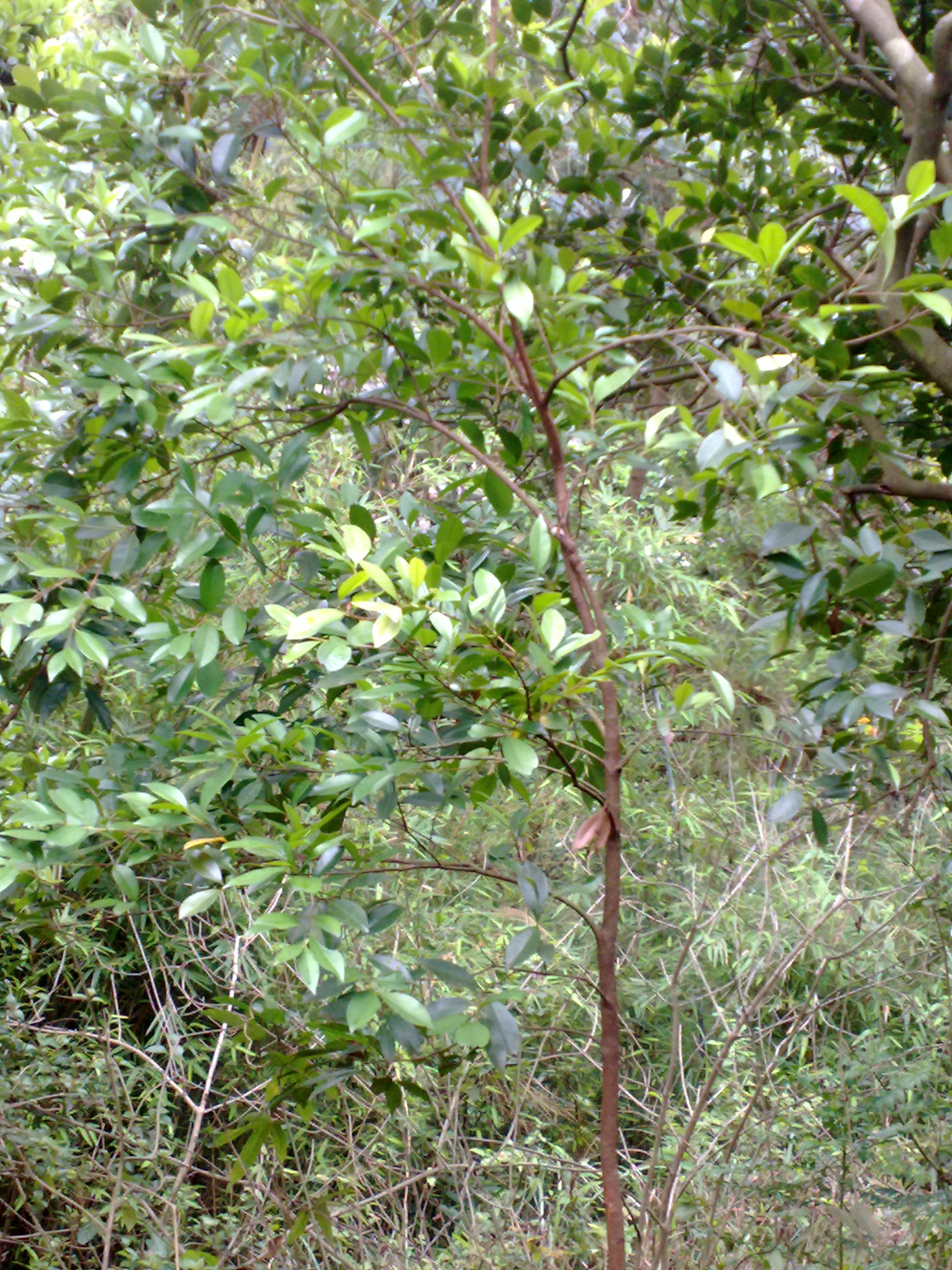 树种特性: 常绿小乔木。高6米,小枝压扁状或近四棱形。叶具短柄、革质、表面具光泽,披针形至长圆状披针形,顶端渐尖,基部楔形、全缘。花绿白色,常数朵聚生。果园球状或卵形。花期3月—5月,果熟期6月-9月。